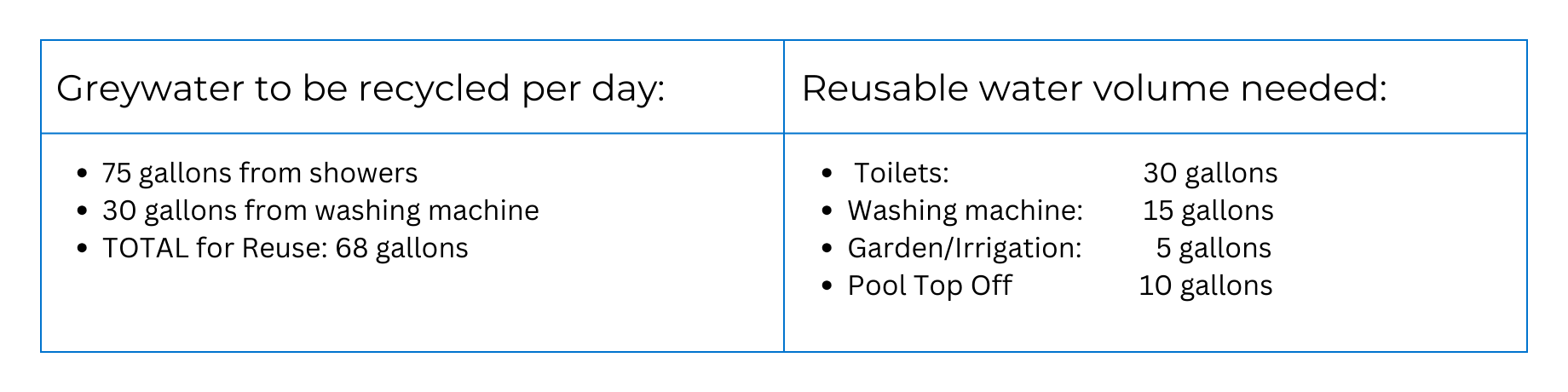 Residential Application: 3-person home, 2000 sq ft, 2 showers, 2 toilets, 1 washing machine, 1 garden/pool.