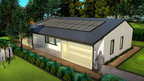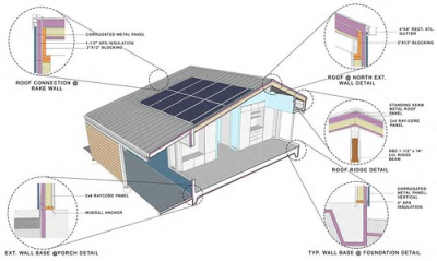 - The team used several prefabrication strategies to keep costs low and achieve efficient construction assemblies, including structural insulated panels (SIPs) and a proprietary prefabricated roof panel.