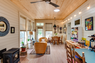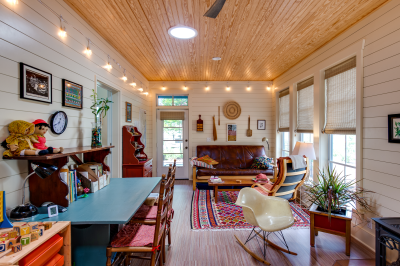 • Roof: Truss monoslope: vaulted parallel chord 16" open-web trusses at 24" o.c., 5/8" plywood sheathing, synthetic roof underlayment, Cool Roof-certified asphalt shingles.