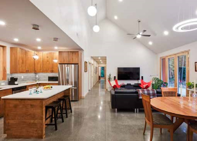 - Roof: Vaulted ceilings with scissor truss, 5/8" coated OSB sheathing with taped seams, high-temperature underlayment, standing-seam metal roof, Cool Roof-certified.
