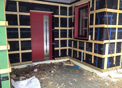 - Walls: 2x4, 24" o.c. + Larsen truss, R-48 total: advanced framed walls with 3.5" blown fiberglass, 7/16" coated OSB taped, TJIs with 9.5" dense-packed fiberglass held by breathable membrane, 2x4 horizontal furring behind vertical Western Red Cedar.