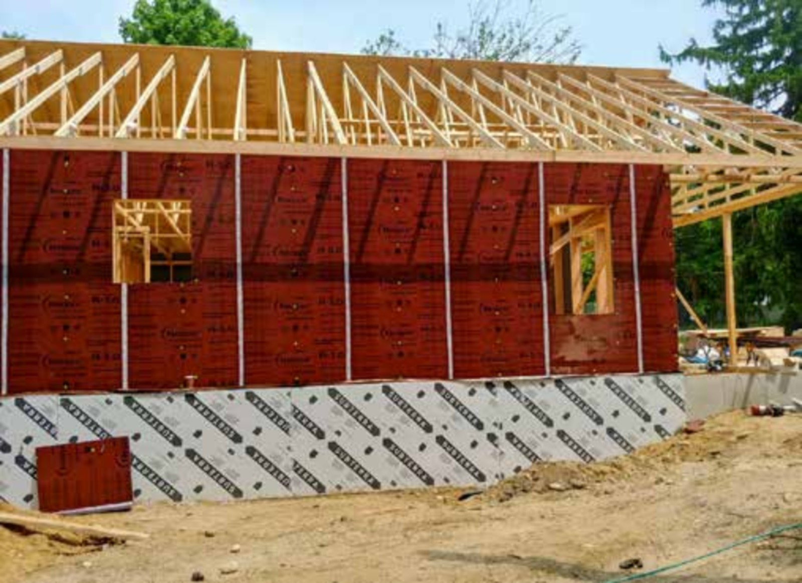 • Walls: R-28 total: 2x6 24" o.c. advanced framed, 3.5 blown fiberglass + 2" closed-cell spray foam in cavity, 1" R-5 graphite EPS sheathing, 7/16" OSB, drain wrap, PVC siding.