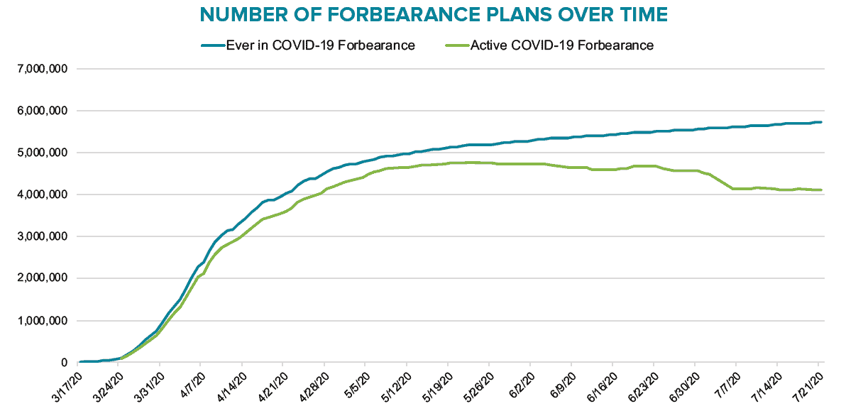 Black Knight’s Mortgage Monitor report shows 4.1 million mortgages in forbearance as of July 21.
