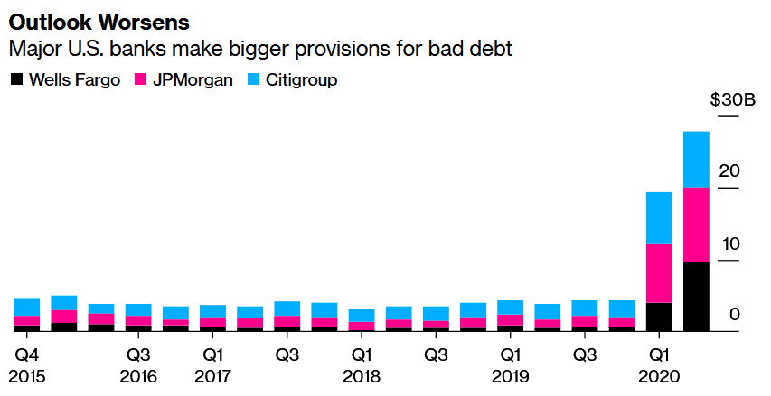 Major U.S. banks see the writing on the wall. Loan loss provisions by JPMorgan, Citigroup and Wells Fargo totaled nearly $28 billion in Q2, just shy of what these banks set aside for bad debts in late 2008.